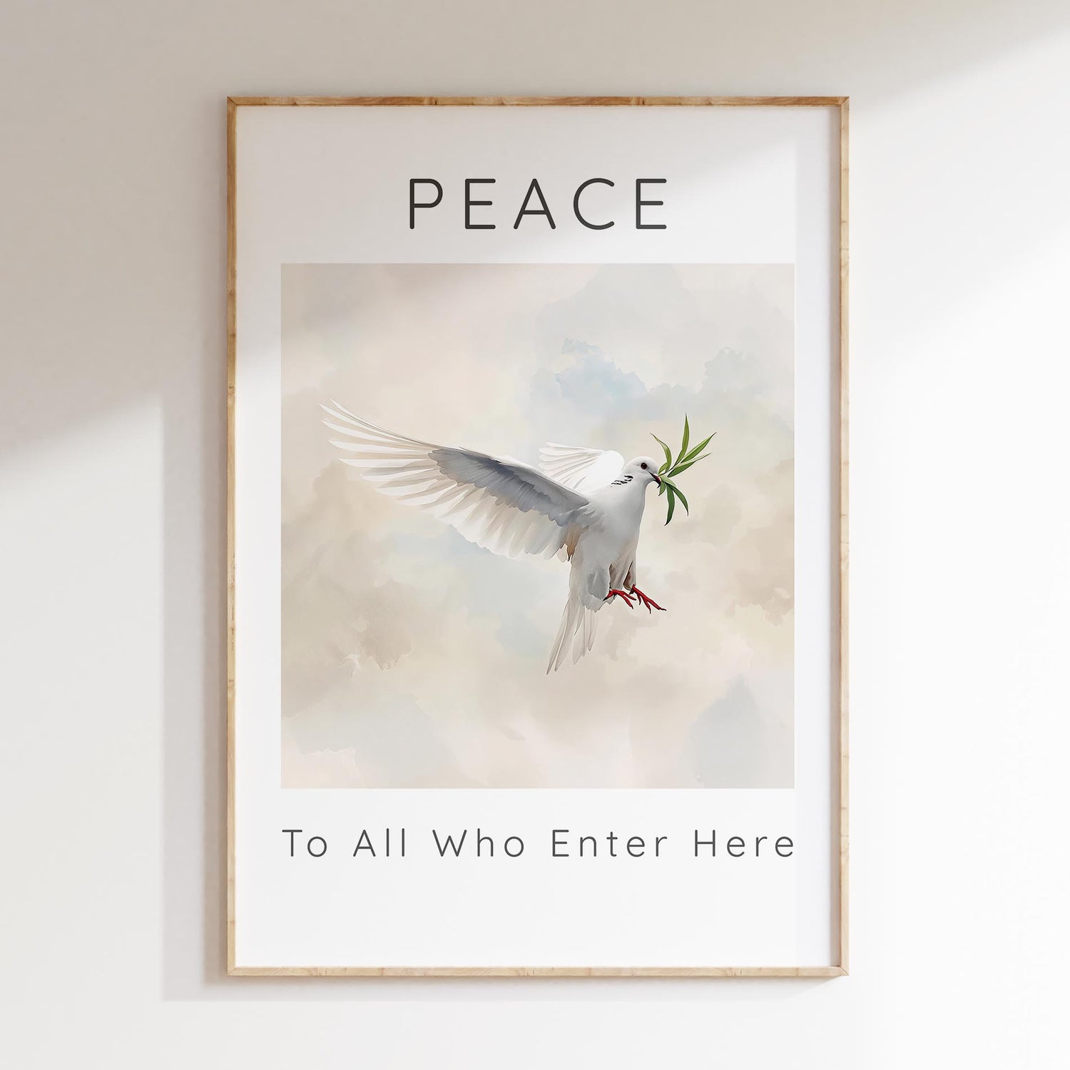 Peace To All Who Enter Here Dove Wall Art Print - Welcome a sense of calm and blessing into your home with this Peace – To All Who Enter Here wall art print. Designed to bring stillness and serenity to any space, it features a graceful white dove in flight, carrying an olive branch — a timeless symbol of hope, renewal, and peace.